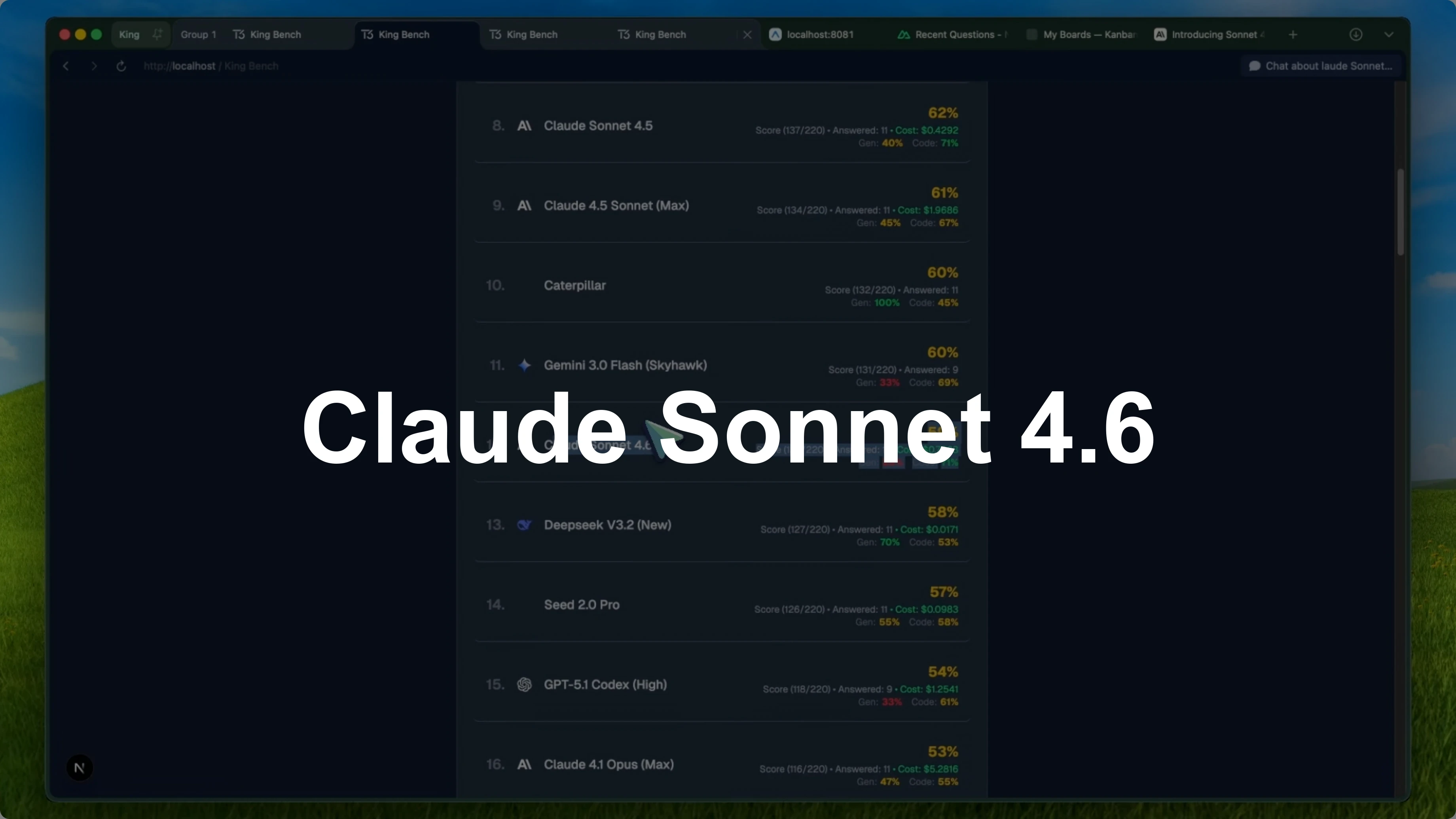 Both cargo check and the Vite build passed with zero errors. Compared to Opus 4.6 with Claude Code, which scored 83.6 on the agent leaderboard, Sonnet 4.6 plus Kilo beat it by over four points. Opus 4.6 costs $5 per million input tokens and $25 per million output tokens, while Sonnet 4.6 costs $3 and $15 respectively.
